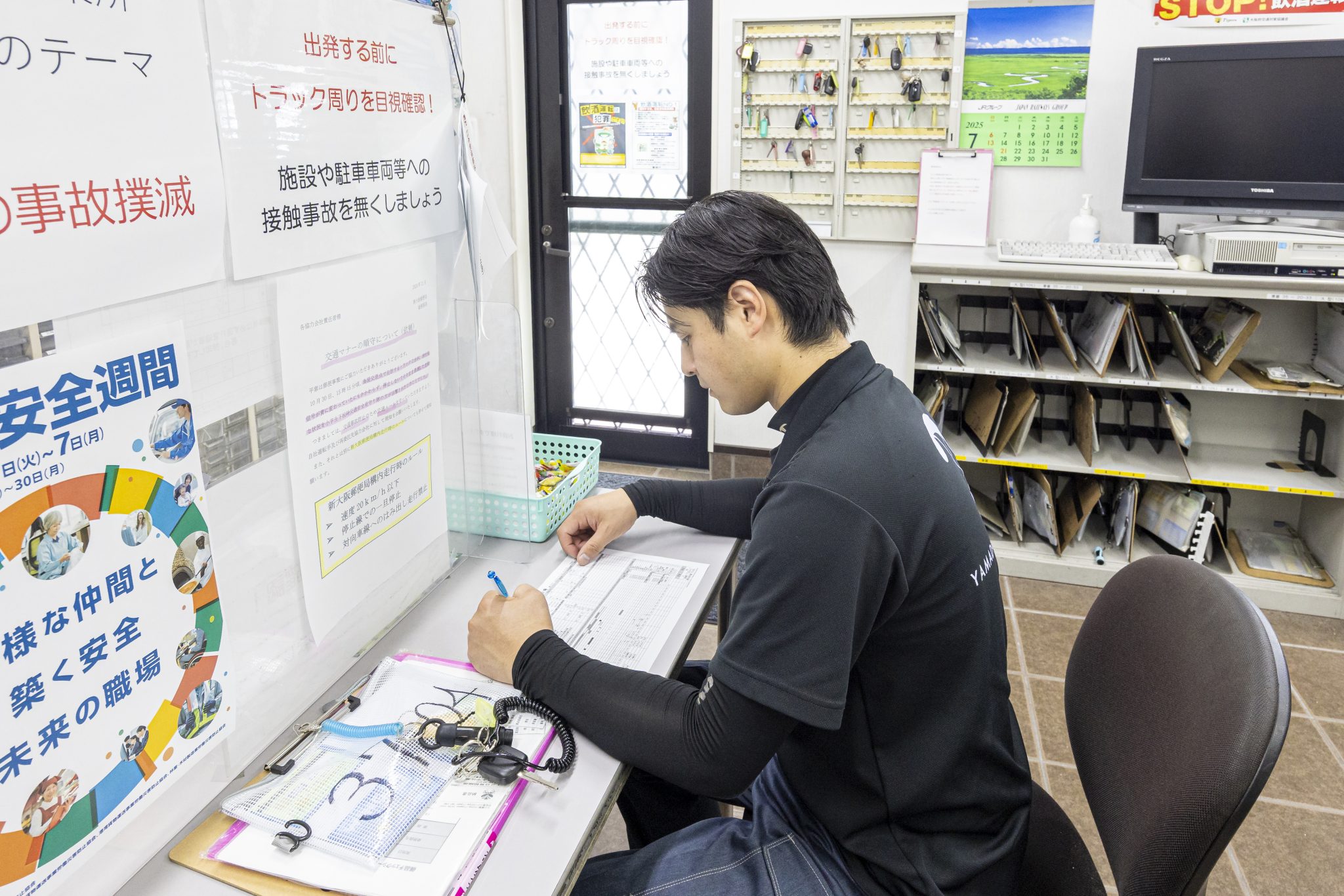 終業点呼:運転日報の記入、アルコールチェック、運行状況の報告などを行い、業務終了となります。