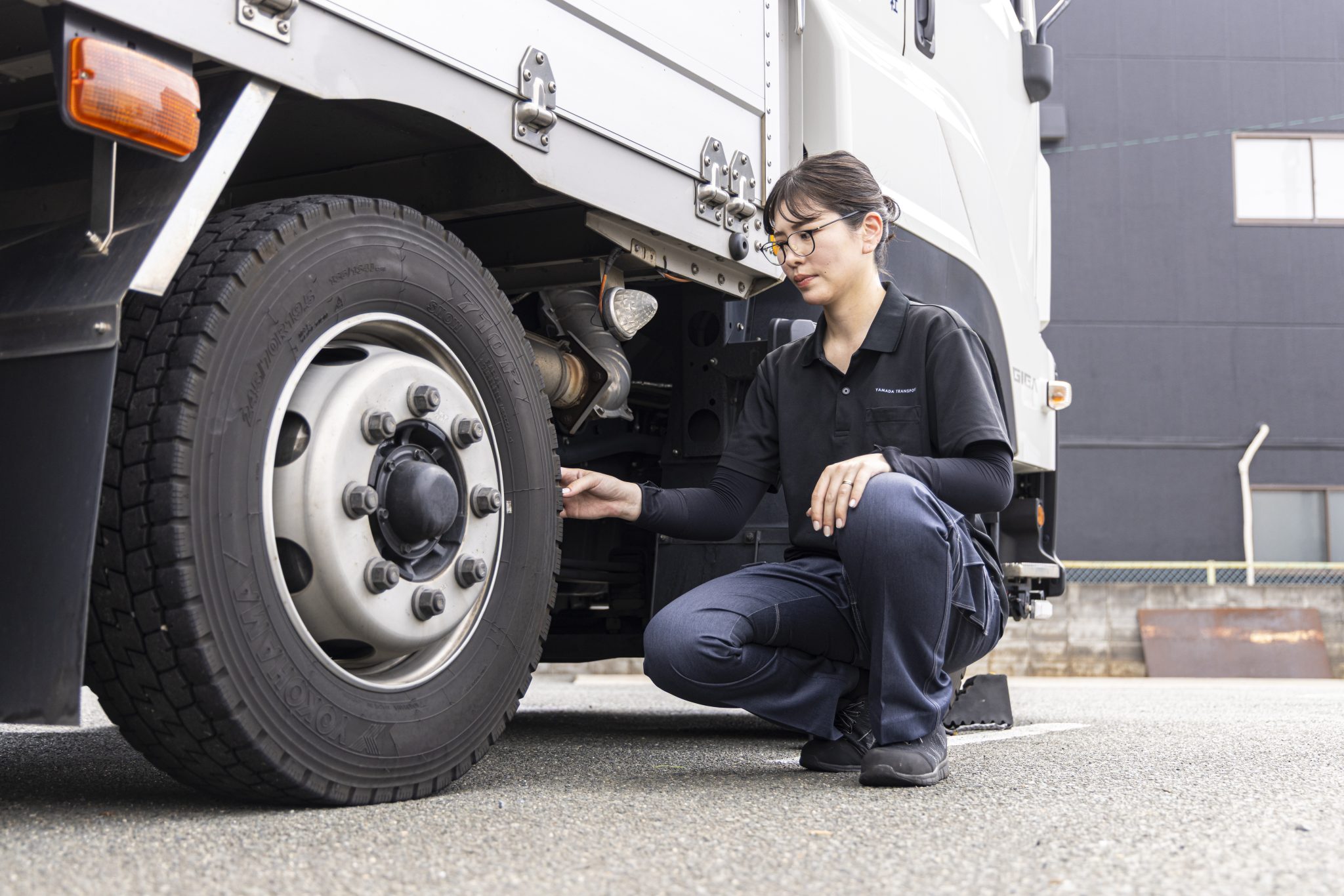 車両点検:トラックのタイヤ、エンジン、ブレーキ、灯火装置など、安全に関わる部分を点検します。